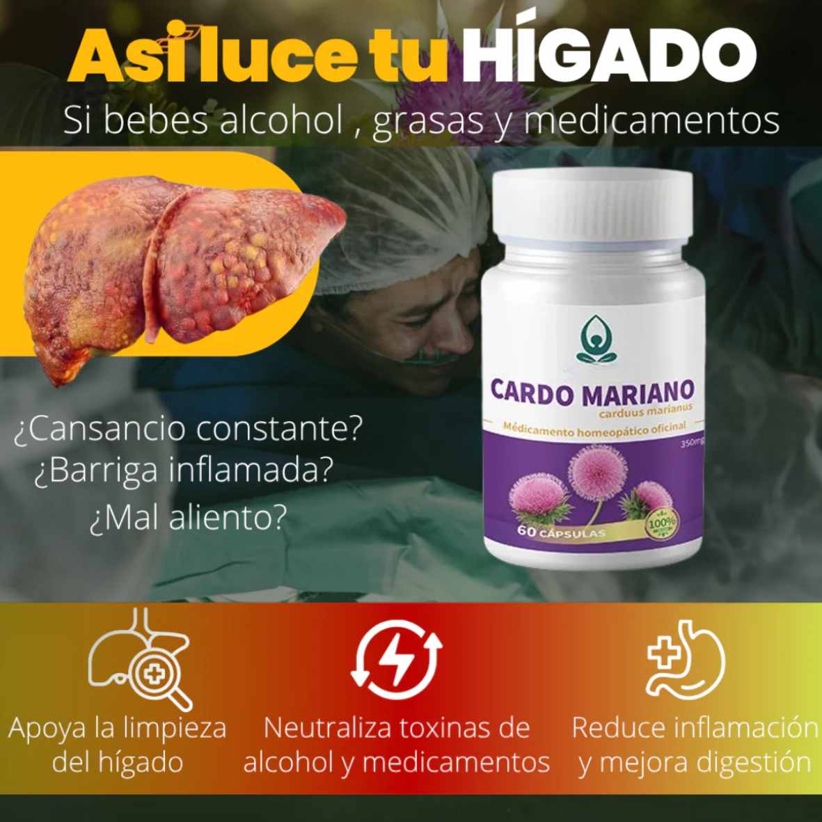 Tu hígado podría estar saturado de toxinas acumuladas por el estrés, una mala alimentación, medicamentos o el consumo frecuente de alcohol. El Cardo Mariano es la solución ideal, con una fórmula potente y completa, regenera tu hígado, desintoxica tu cuerpo, mejora tu digestión y regular tu colesterol.